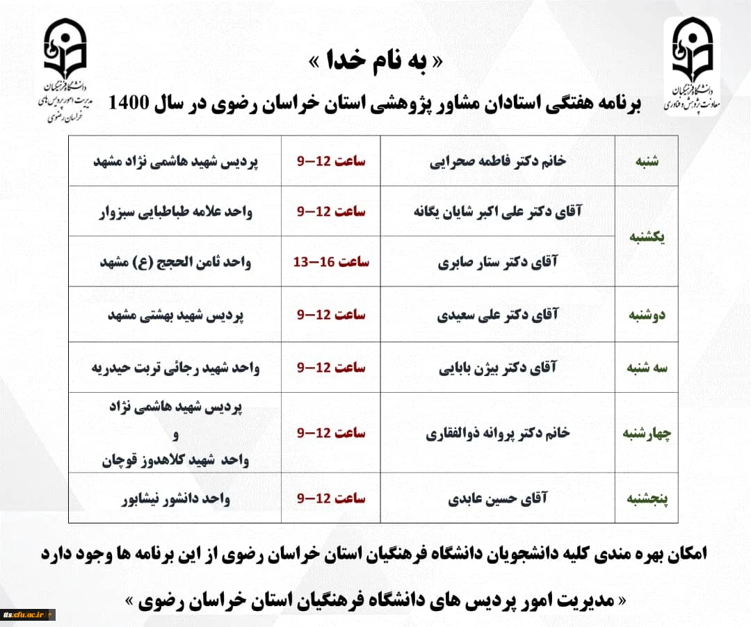امتیاز دهید : برنامه استاد مشاوران پژوهشی دانشگاه فرهنگیان استان خراسان رضوی 3 دوشنبه 6 اردیبهشت 1400 ساعت 8:13