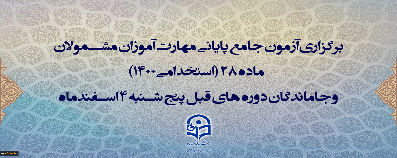 برگزاری آزمون جامع پایانی مهارت آموزان مشمولان ماده 28 (استخدامی1400) و جاماندگان دوره های قبل پنج شنبه 4 اسفندماه 2